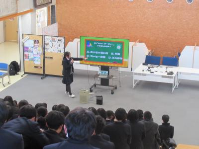 後半には、「クリエーティブをやってみよう」ということで、実際にお題を出していただき、挑戦しました。生徒たちは、興味津々で、様々な視点から面白いアイデアをたくさん出していました。とても充実した時間を過ごすことができました。
